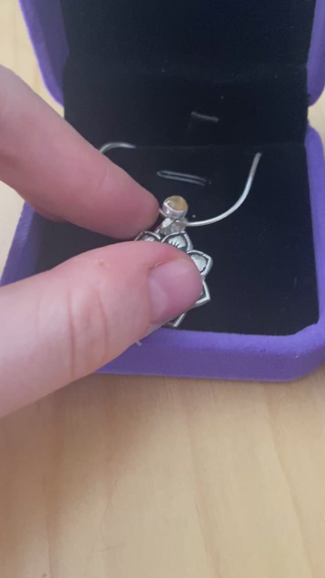 Sterling silver may tarnish if exposed to moisture. You can gently rub it with toothpaste and rinse, or use a silver polishing cloth.