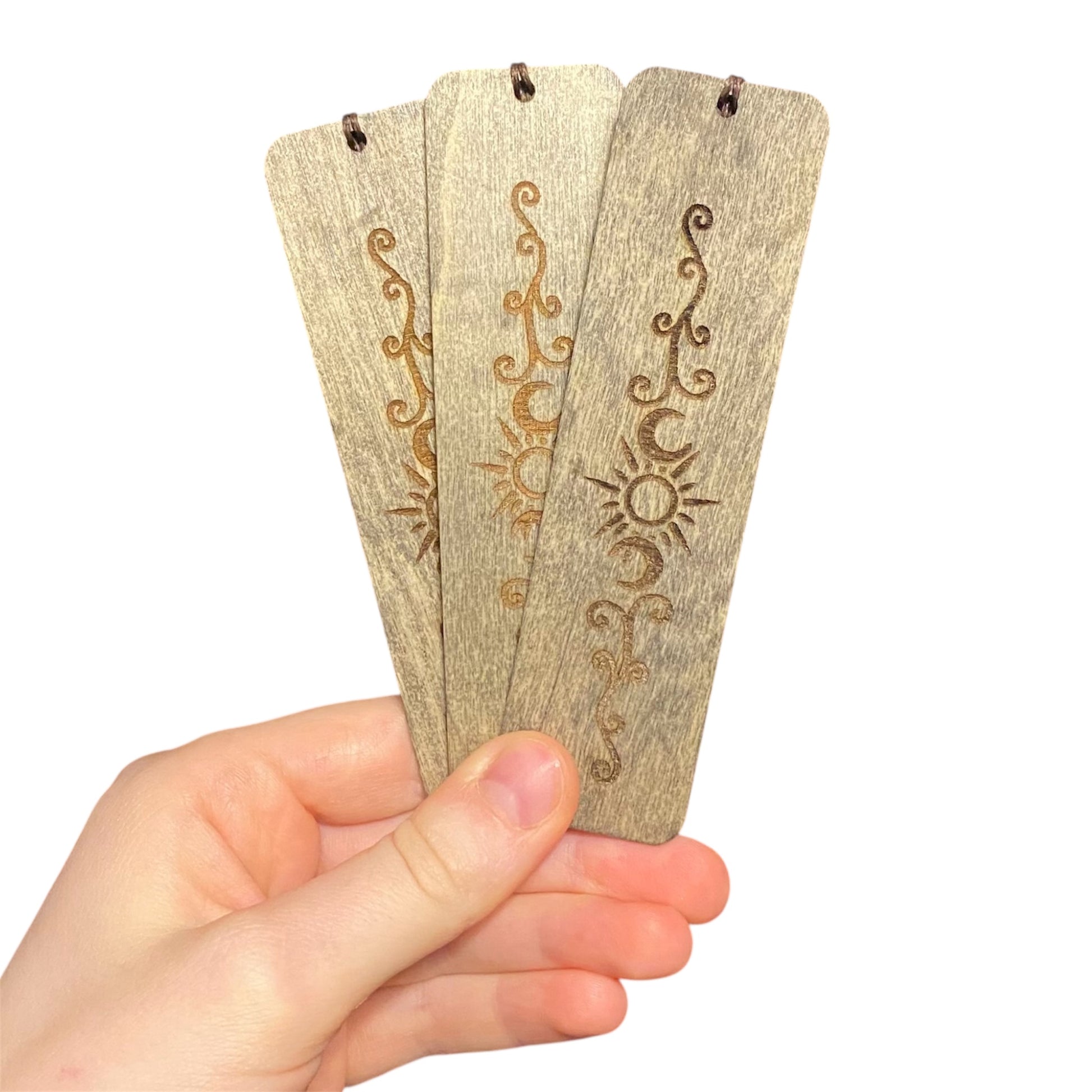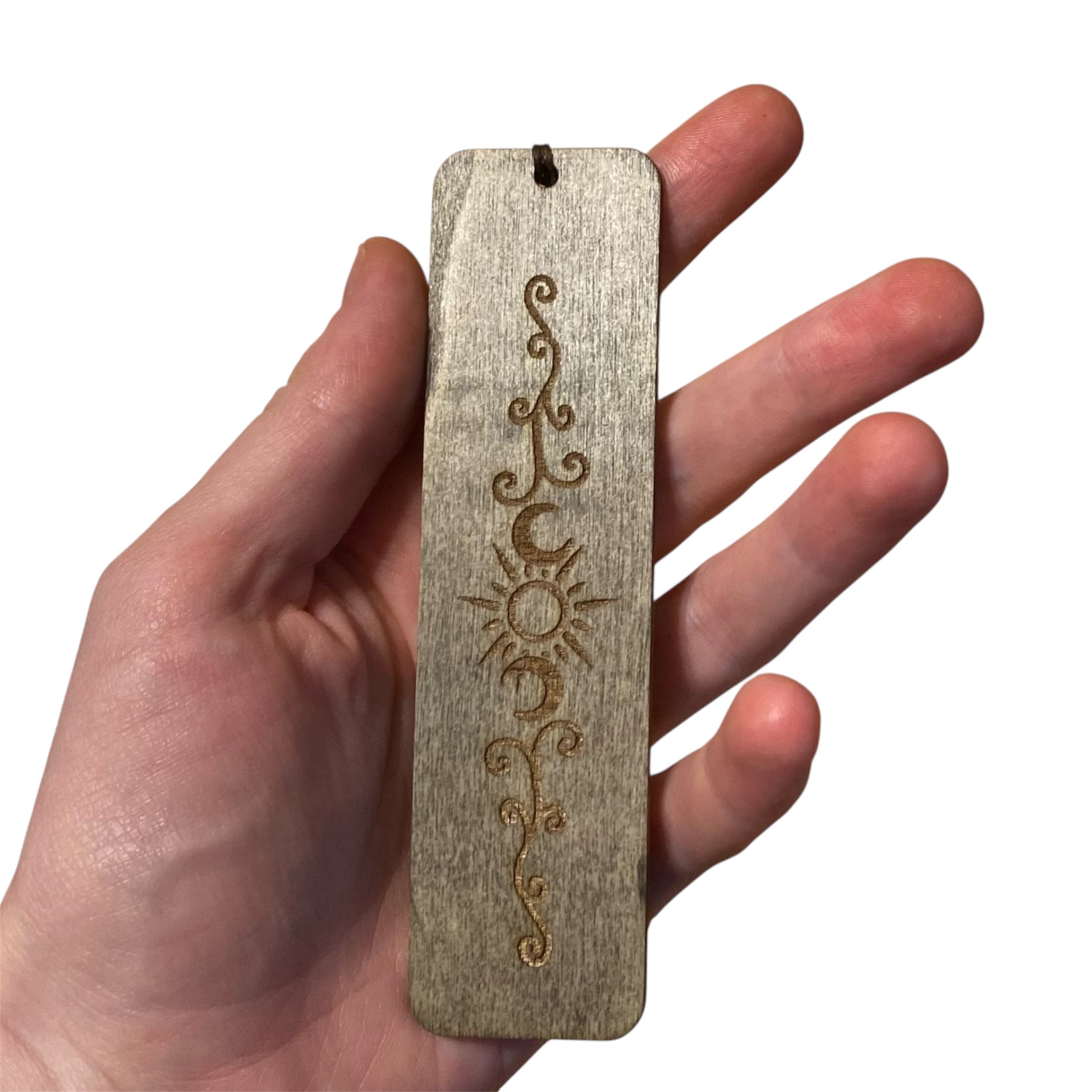 Cette marque-page a été réalisée avec soin, étape par étape. J'ai d'abord appliqué un vernis noir clair afin de le protéger et d'assurer une belle durabilité. Ensuite, j'ai dessiné à la main le modèle : d'un côté, deux fleurs délicates, et de l'autre, deux soleils accompagnés d'une lune, symboles d'équilibre et d'harmonie.